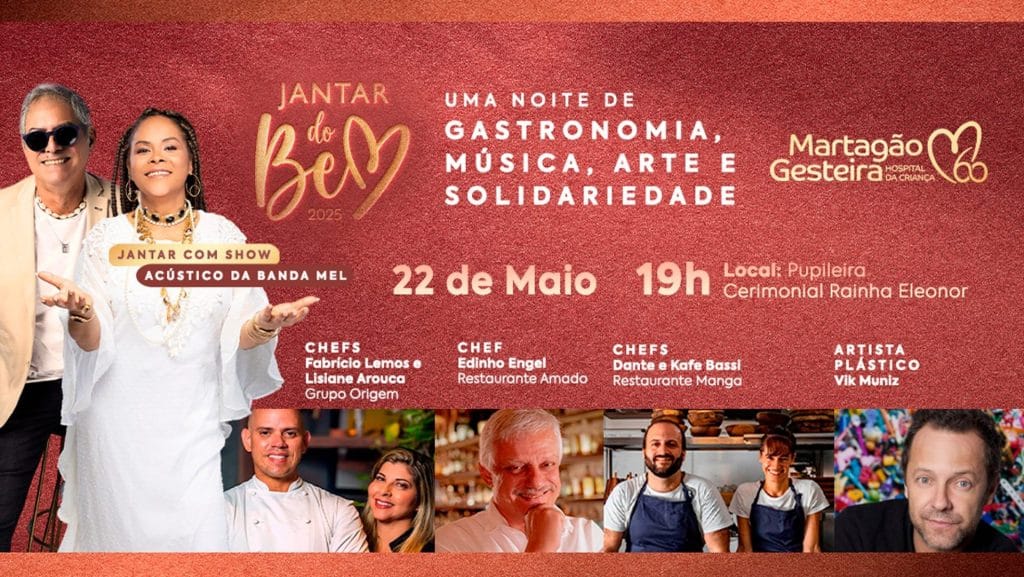 No próximo 22 de maio, na Pupileira, a solidariedade terá um encontro marcado com a gastronomia, a música e as artes plásticas. Tudo isso em prol da causa da saúde da criança e do adolescente. É que nesta data será realizado o VI Jantar do Bem do Martagão Gesteira. Nesta edição especial, que celebra os 60 anos do Hospital, a Banda Mel fará um show acústico em comemoração aos 40 anos da Axé Music.